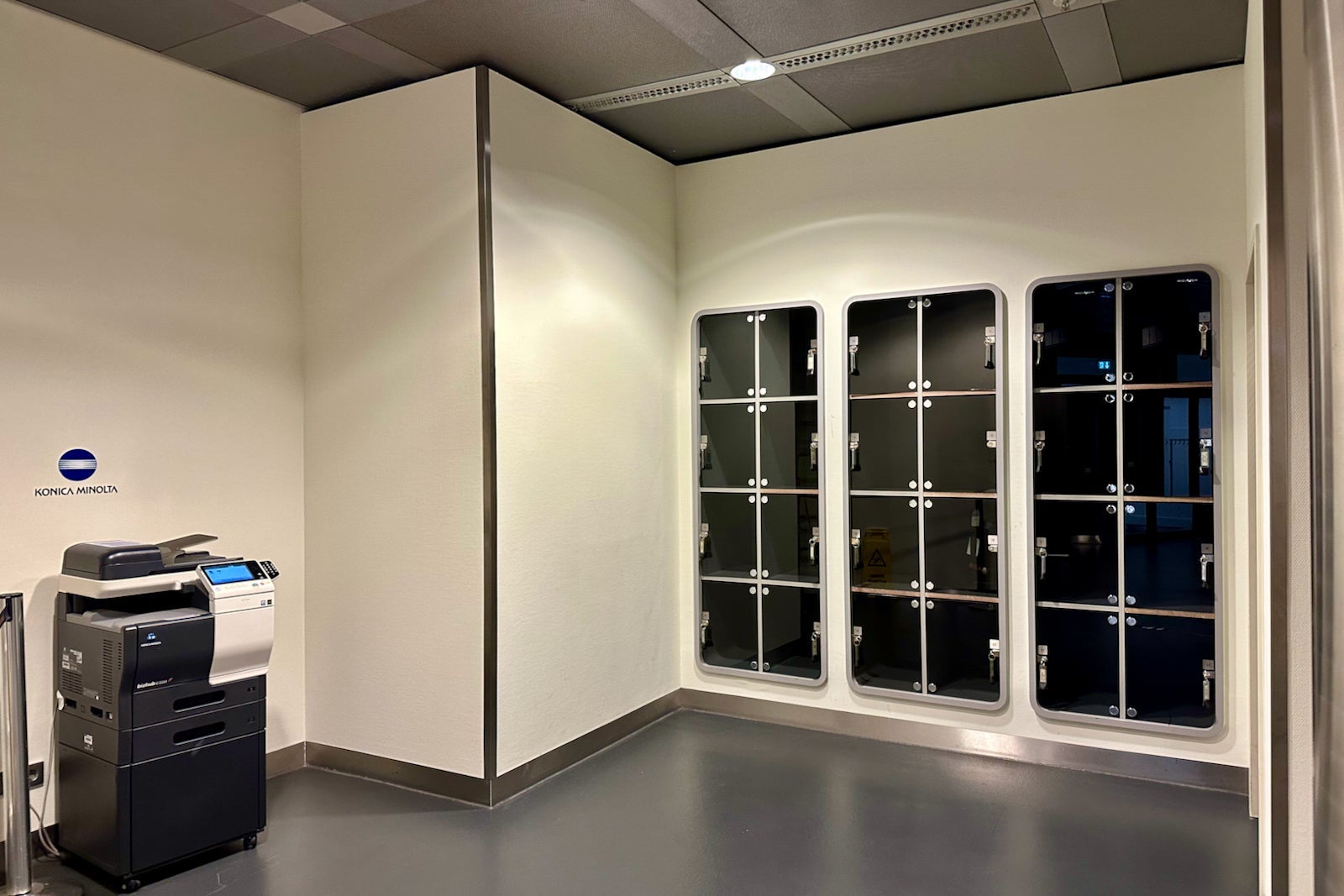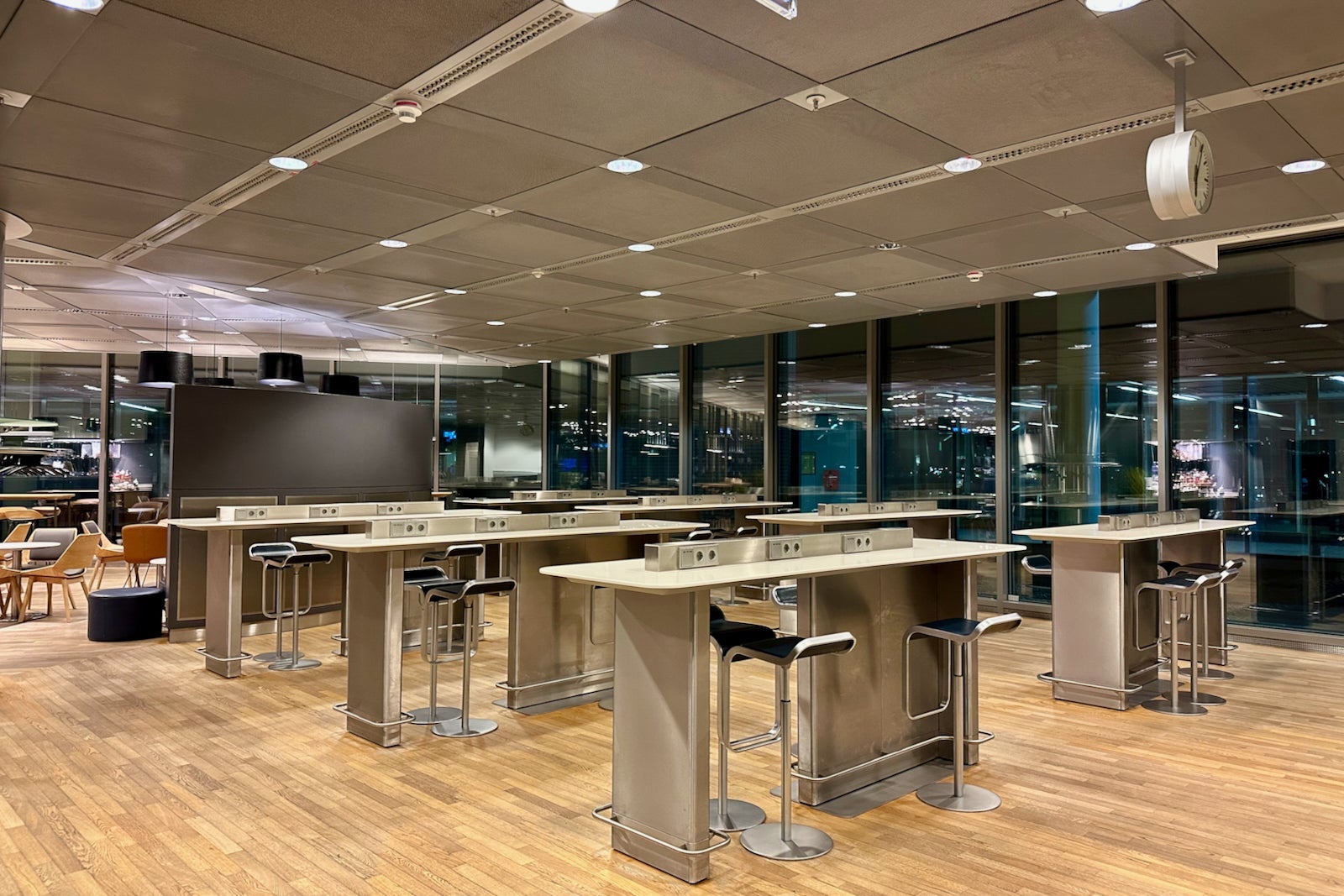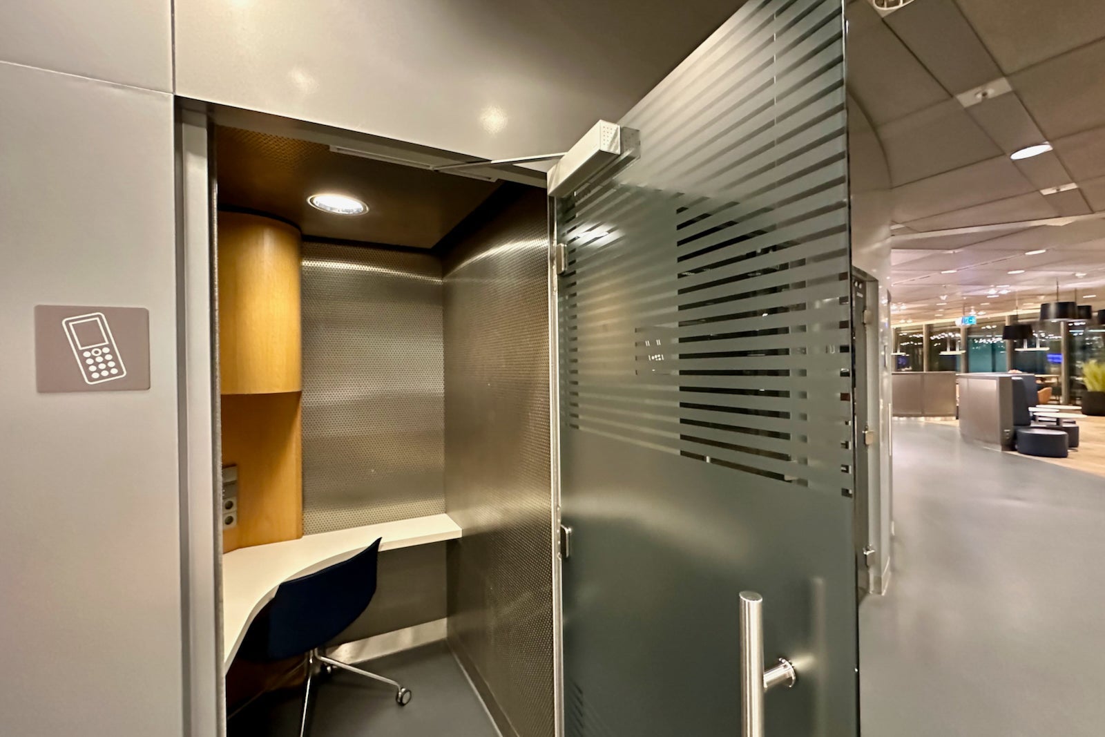 There was plenty of seating spread throughout the circular lounge, and there were some individual phone booths and workstations lining the walls, too.