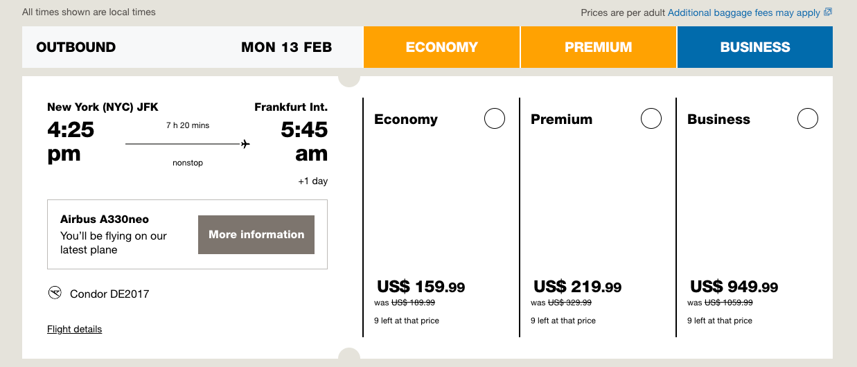 The airline's fares and availability are available through major online travel agencies, including my go-to travel search site, Google Flights. Though Condor is a budget carrier, it offers a business-class product.