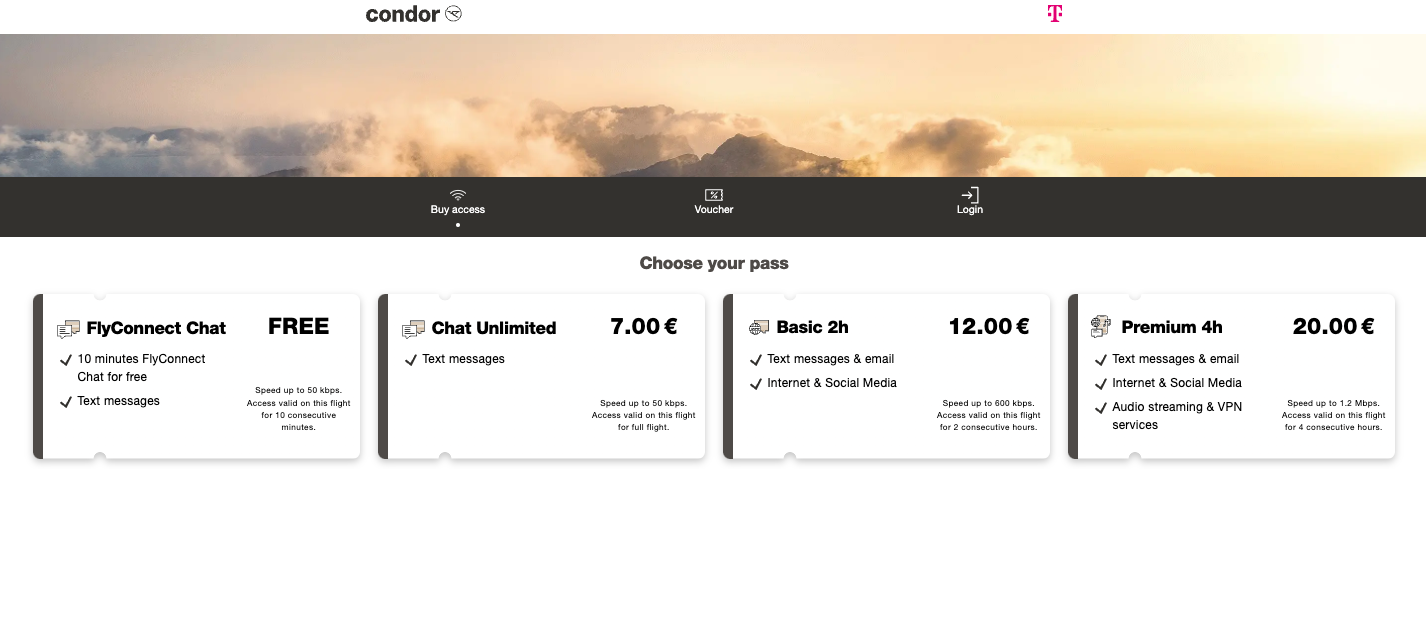 Three passes were available for purchase, and while there are no data caps, the basic and premium packages had a two-hour and four-hour time limit, respectively. At 20 euros for every four hours, it could cost a pretty penny to stay connected during some of the longest Condor flights.