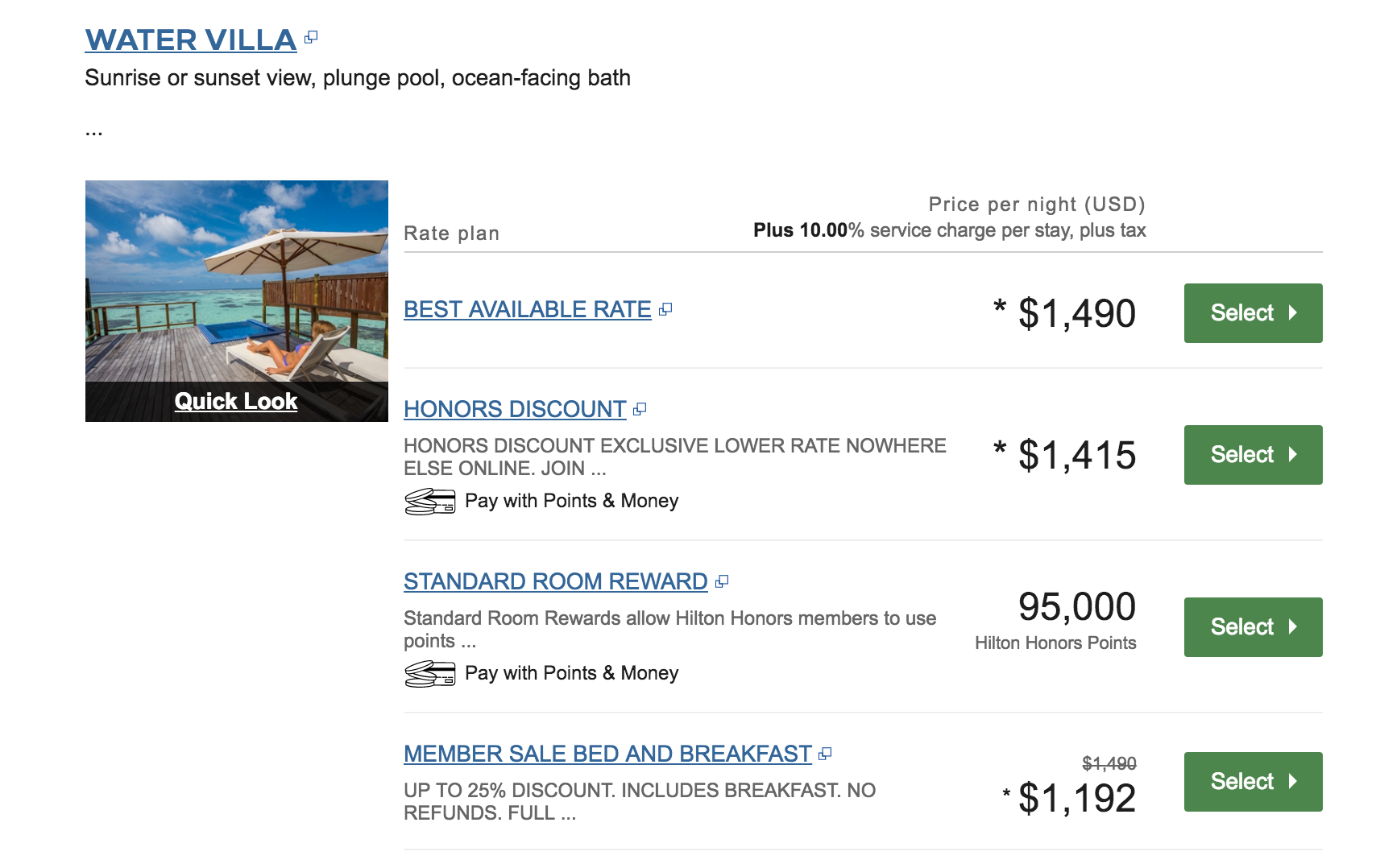 Typically, you can only book these rooms by paying outright with cash or by paying 322,000 points per night. Additionally, you could book the standard Beach Villa and then pay with cash to upgrade to the Water Villa. Either way, this 95,000-point rate for the Water Villa is a steal. If this is indeed a mistake, and Hilton ends up honoring the rate at the Conrad Maldives, you could come away with a great redemption.