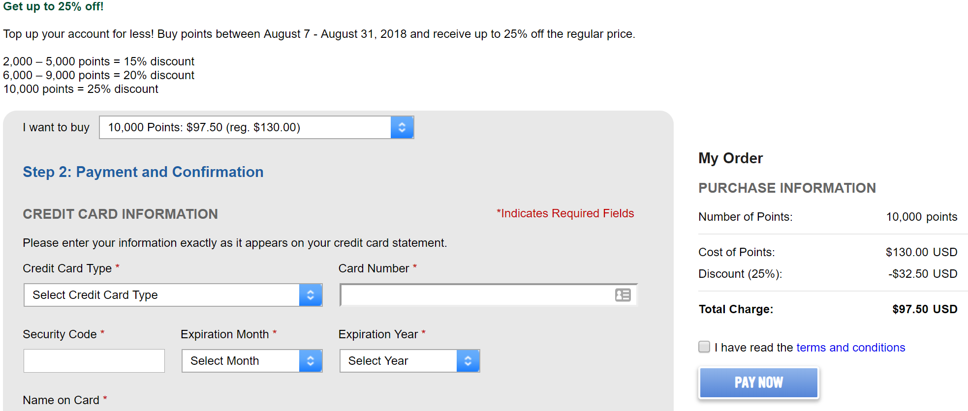 To get the full 25% discount, you'll need to buy 10,000 points, which will cost a total of $97.50 — or 0.975 cents per point — through Points.com.