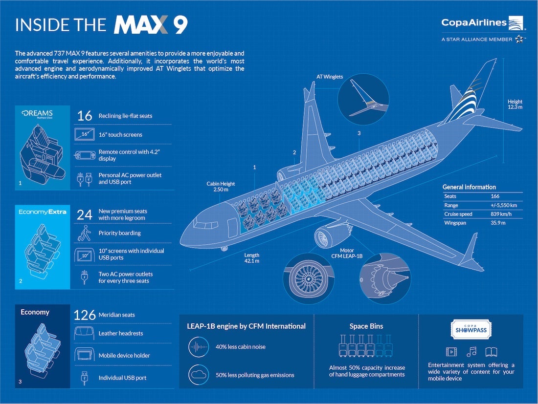 Panamanian carrier Copa Airlines officially revealed the layout of its first Boeing 737 MAX 9 Tuesday, introducing 166 seats in an updated there-cabin design: Business, Economy Extra and economy.