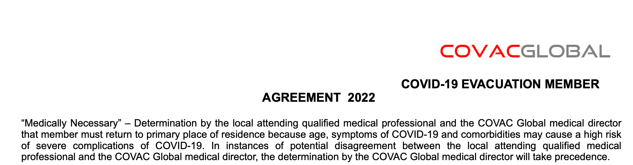 Additionally, both a "local attending qualified medical professional" and the Covac medical director must sign off on the decision to evacuate in the name of "medical prudence," as now outlined in the 2022 COVID-19 Evacuation Membership Services Agreement. Below is an agreement that Covac sent out to members before the updated language.