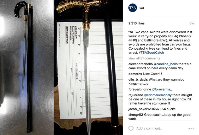 These cane swords look like something you might see in a movie, but they really did belong to passengers in Phoenix (PHX) and Baltimore (BWI) who wanted to bring them on board a plane in their carry-on luggage. Remember that concealing knives of any kind can result in fines or even arrest.