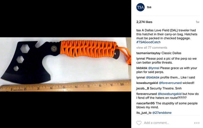 This compact tool looks like it could be very useful for many tasks, but if you want to take your hatchet on a trip with you, remember that it has to travel in the cargo hold. This item was confiscated by TSA agents at Dallas Love Field (DAL).