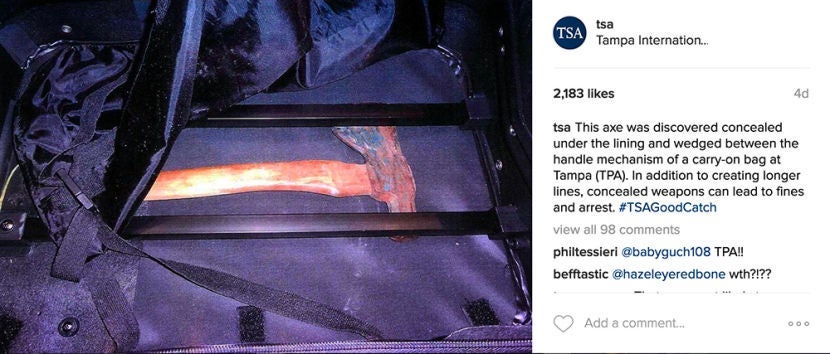 A traveler in Tampa (TPA) apparently thought that they were being sneaky by attempting to hide an axe beneath the fabric and then lodged it in between the handles. The TSA wasn't fooled, however, and the axe was confiscated. While this fabric might stop agents from spotting contraband with the naked eye, it's no match for the x-ray scanners.