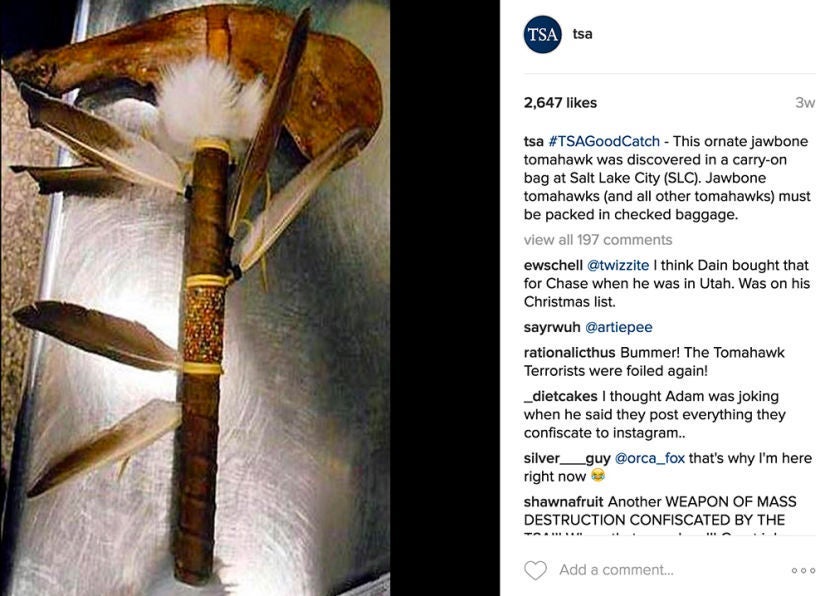 One passenger thought that their decorative (but still lethal) jawbone tomahawk could travel in the cabin with them, but TSA guidelines say that all tomahawk weapons must be packed with your checked baggage. This weapon was confiscated at Salt Lake City International Airport (SLC).