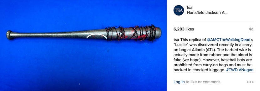 If you're a fan of The Walking Dead TV show, you'll quickly recognize this replica "Lucille" that a passenger at Atlanta Hartsfield-Jackson International Airport (ATL) tried to bring along with them in a carry-on bag. The modified baseball bat featured barbed wire made from rubber and imitation blood, but regardless, baseball bats have to be stowed in checked luggage if you want to bring them along on a trip with you.