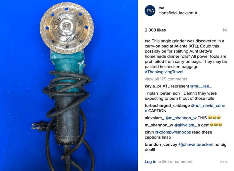 If you're doing home improvement projects for a relative over the holidays, brush up on the TSA's guidelines for traveling with power tools. They can travel with you — but only if they're stowed safely in your checked luggage. This tool was confiscated at Atlanta Hartsfield-Jackson International Airport (ATL).
