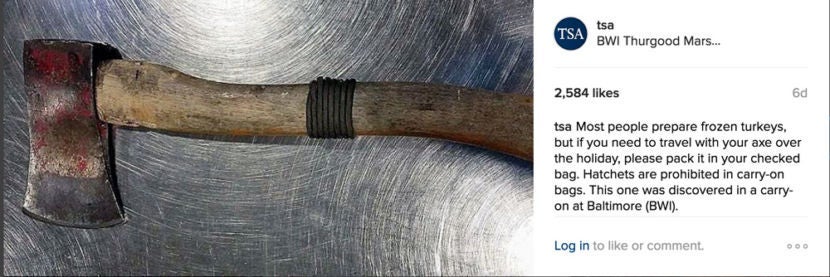With cold winter weather (almost) upon us, you never know when you'll need your trusty axe to help you make a toasty fire, but remember to pack it in your checked luggage when you make your way through the airport to grandmother's house. This axe was discovered at Baltimore-Washington International Airport (BWI).