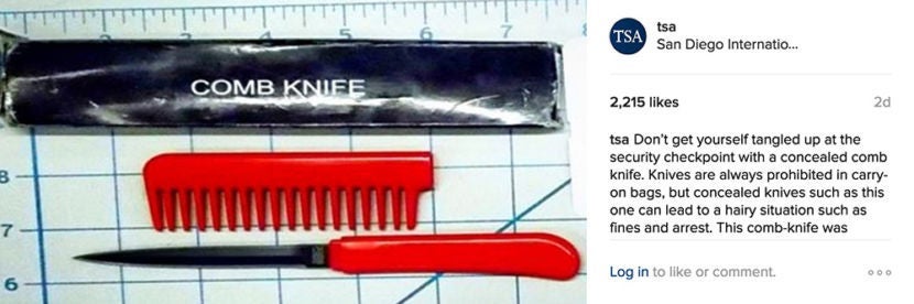 While this comb/knife combo scores a lot of points for supreme utility, it's not a great idea to try to get it through the TSA checkpoint — this is a concealed weapon, meaning you could be subject to fines and even arrest. If you want to bring a comb knife along on your next trip, make sure it's safely stowed in your checked luggage. This weapon was confiscated at San Diego International Airport (SAN).