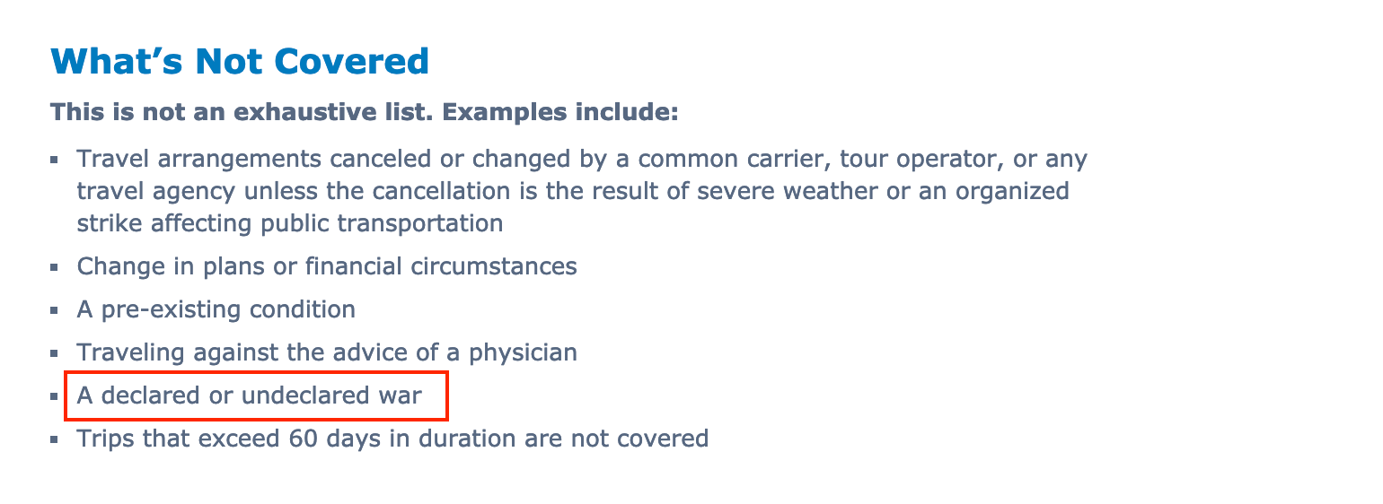 Let's start with the easiest part of Hasham's question: whether travel insurance would cover him in the event of a cancellation. While he didn't specify which card he used to book, let's assume he picked a card with a comprehensive travel insurance policy like the Chase Sapphire Reserve or The Platinum Card® from American Express. While the Sapphire Reserve is widely considered to be the best card for travel insurance, Chase explicitly identifies both declared and undeclared wars as events that are not covered.