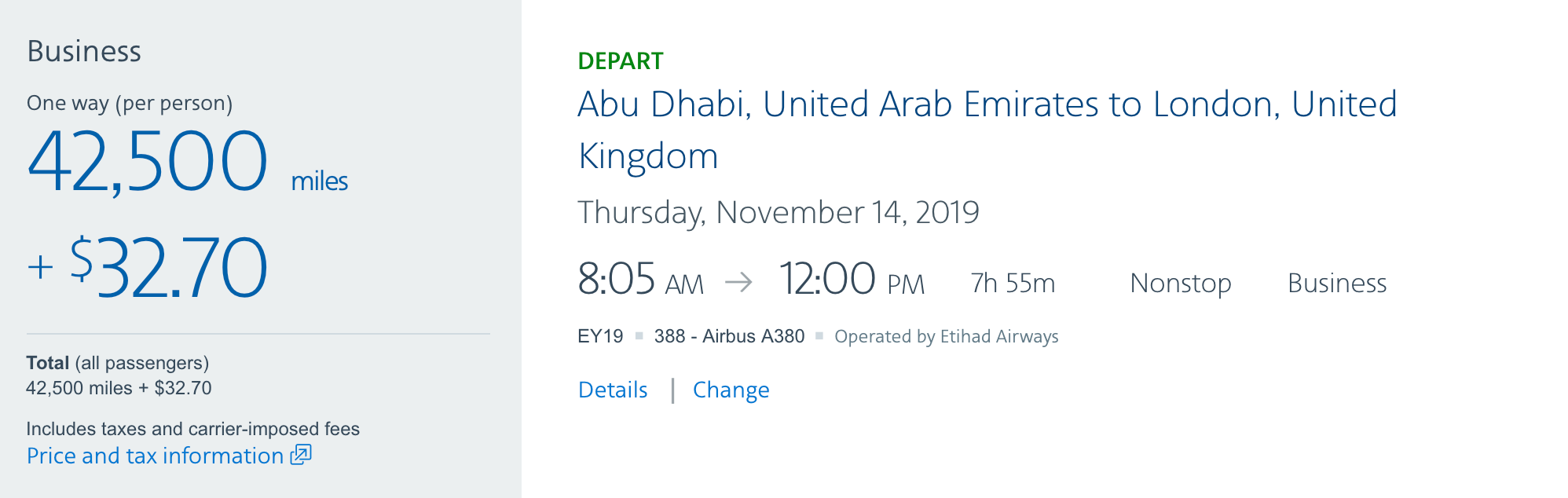 But if that's still too many miles to part with, Etihad's formidable business class will only set you back 42,500 miles plus taxes and fees between Abu Dhabi and Europe.
