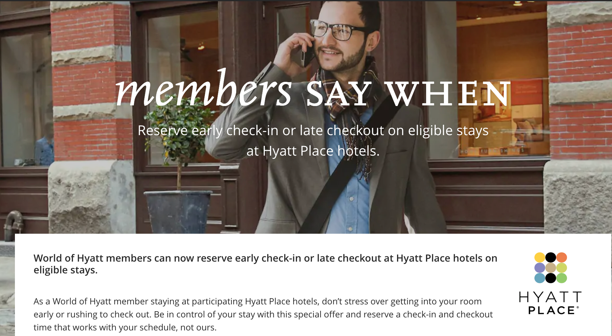 "The Hyatt Place brand's early check-in/late checkout offering is available at participating Hyatt Place hotels. Please know that in order for members to take advantage of this offering, they have to reserve early check-in or late checkout in advance. There are three ways in which a member can reserve early check-in or late checkout in advance for eligible stays at participating Hyatt Place hotels: