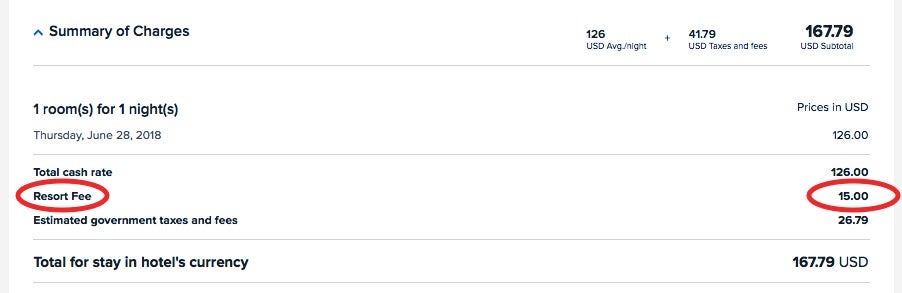 Notice that in the above screenshot, "taxes and fees" is not hyperlinked. There's no breakout anywhere of what those taxes and fees consist of. It's purposely kept opaque to make the traveler believe the state and municipality has levied mandatory taxes of 35.1% on your reservation.