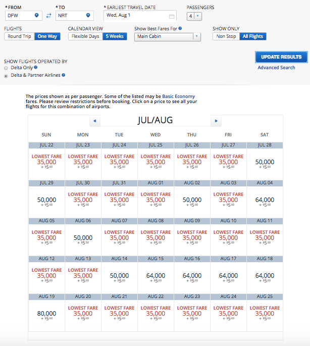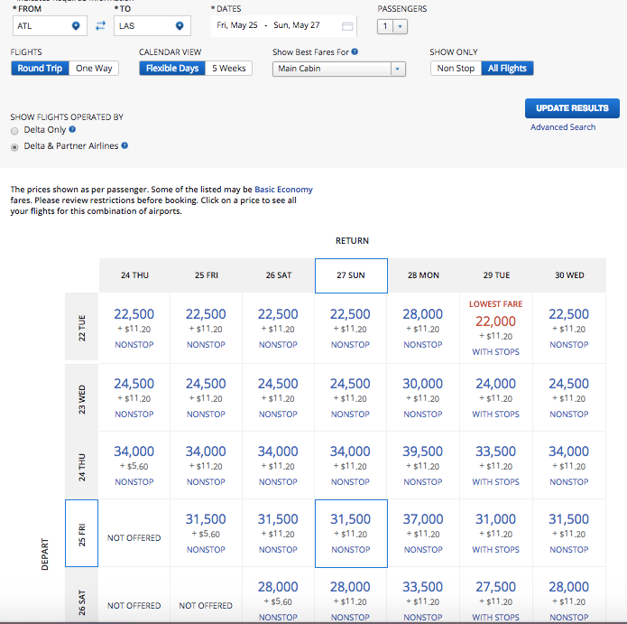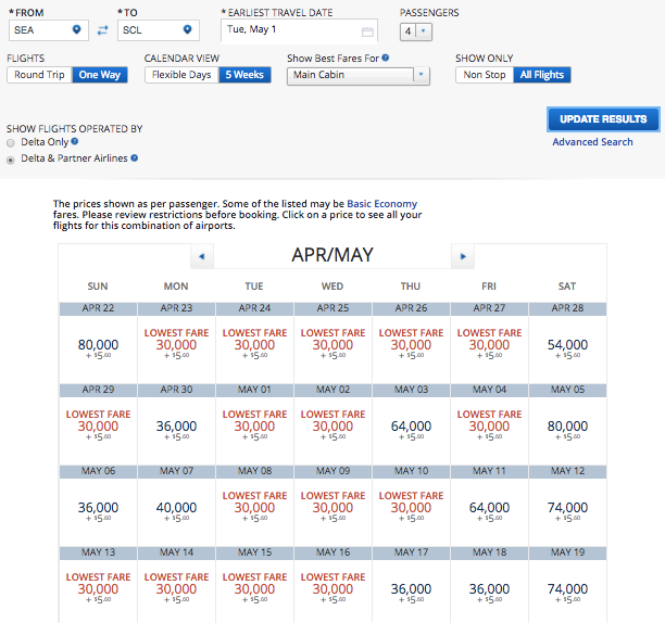 So what were the award options? Well, United had no saver award seats and American wanted two connections and 14 hours of travel time for 30,000 miles each way with AAnytime awards (on a US Airways legacy A321). But look at the mileage Delta wanted (and still wants) for the holiday-weekend flights: