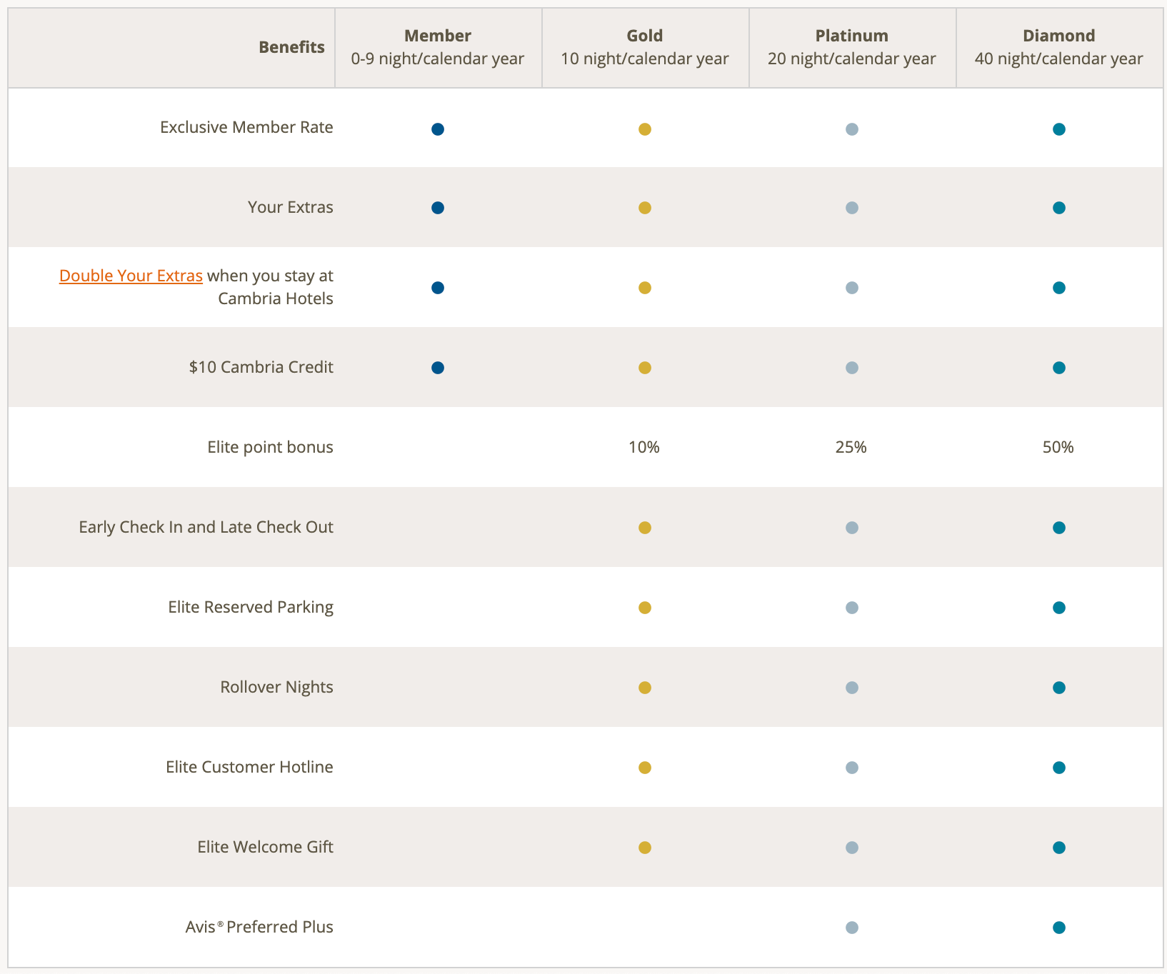 On top of the published benefits in the chart above, elite members of any level also get Your Extras rewards like Starbucks gift cards, Fuel Rewards savings, airline miles or an Uber discount code. Specifically at Cambria hotels, any elite member receives $10 in food and beverage credit, double Your Extras rewards on weekday stays, early check-in/late check-out and preferred, elite-member parking.