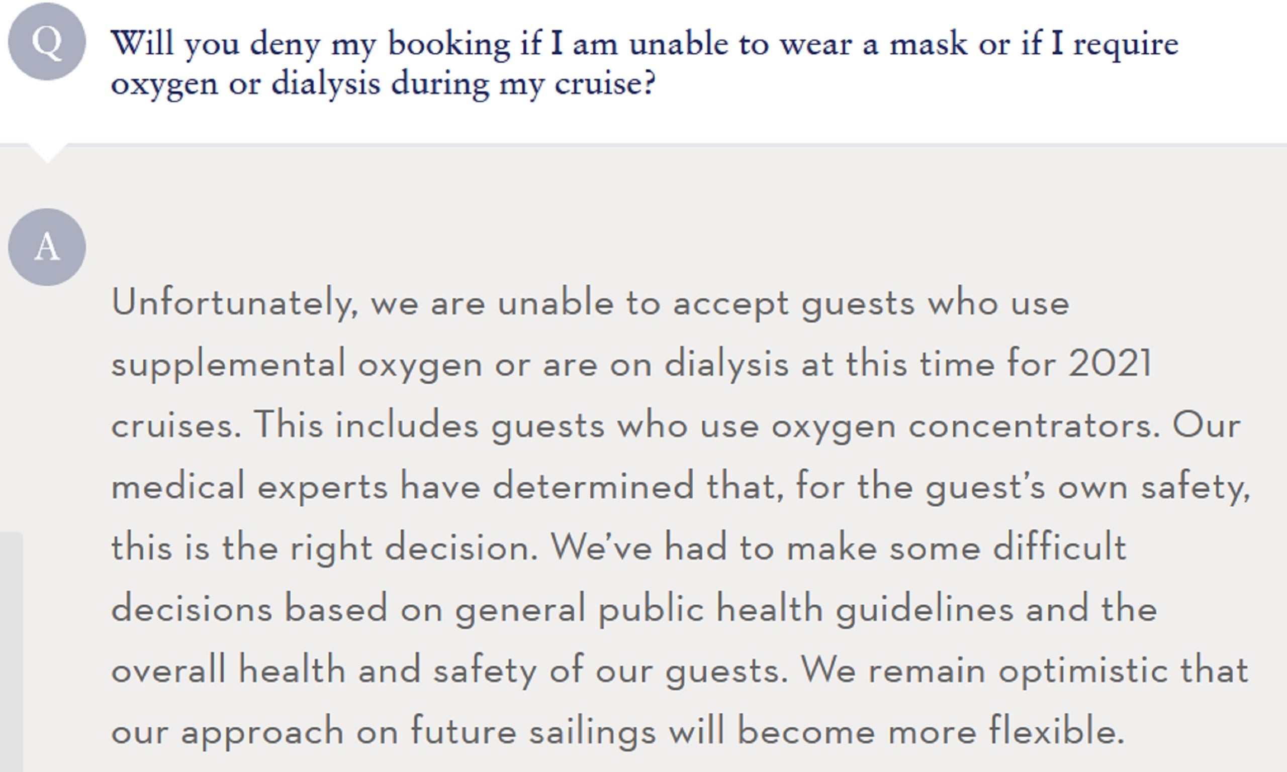If you need oxygen or dialysis, you won't be able to sail with Carnival Cruise Line, Holland America Line or Princess Cruises right now. The same goes for passengers who are unable (or unwilling) to wear masks.