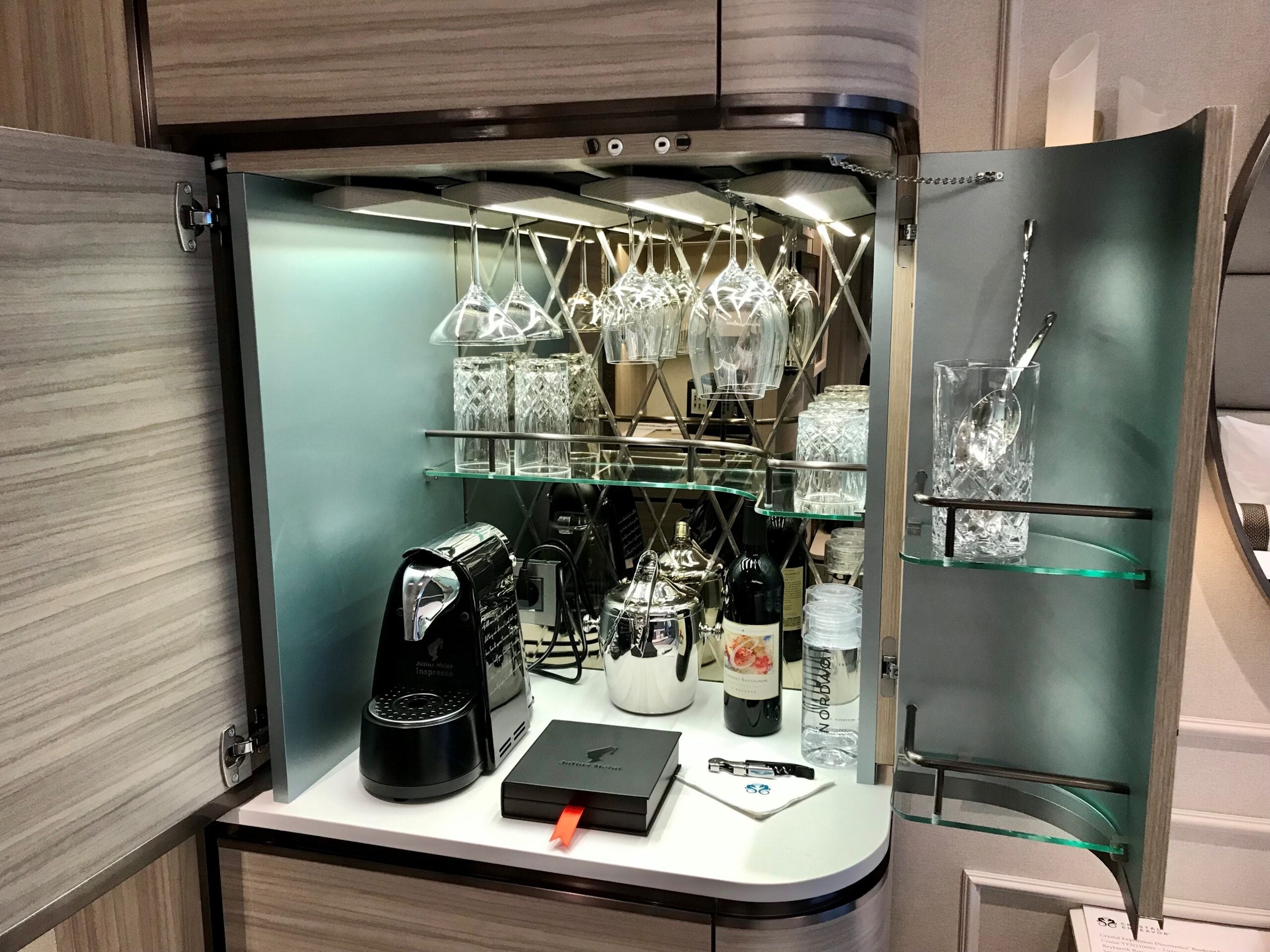 As noted above, each cabin on Crystal Endeavor also comes with its own fold-out bar area, with pre-stocked bottles of complimentary wine and Champagne, beer and sodas. If you want some other type of drink, just let your butler know. It'll magically appear. The bar area also has its own Julius Meinl pod-type coffee maker, with pods that your butler will replenish daily.