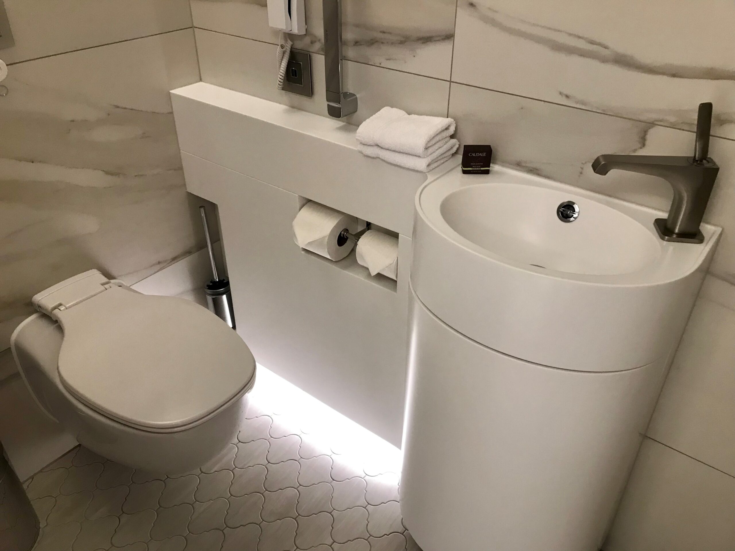 As much as I love the main part of my room, I'm even more excited about the cabin's bathroom, which is sleek and modern with lovely marbled tile walls.