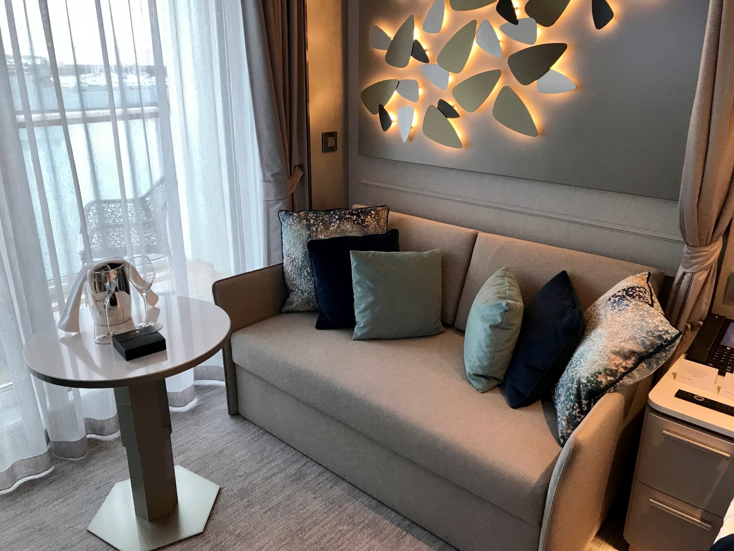 My cabin -- a "deluxe suite," the most common and smallest type of cabin on the ship -- also has a narrow vanity area across from the bed with a large round mirror (and yet more outlets of all kinds). There's also a separate seating area with a sofa, table, two chairs and a desk. The table, notably, is height-adjustable. Along with the two chairs, it can be configured for in-room dining for two -- something that your butler will happily arrange.