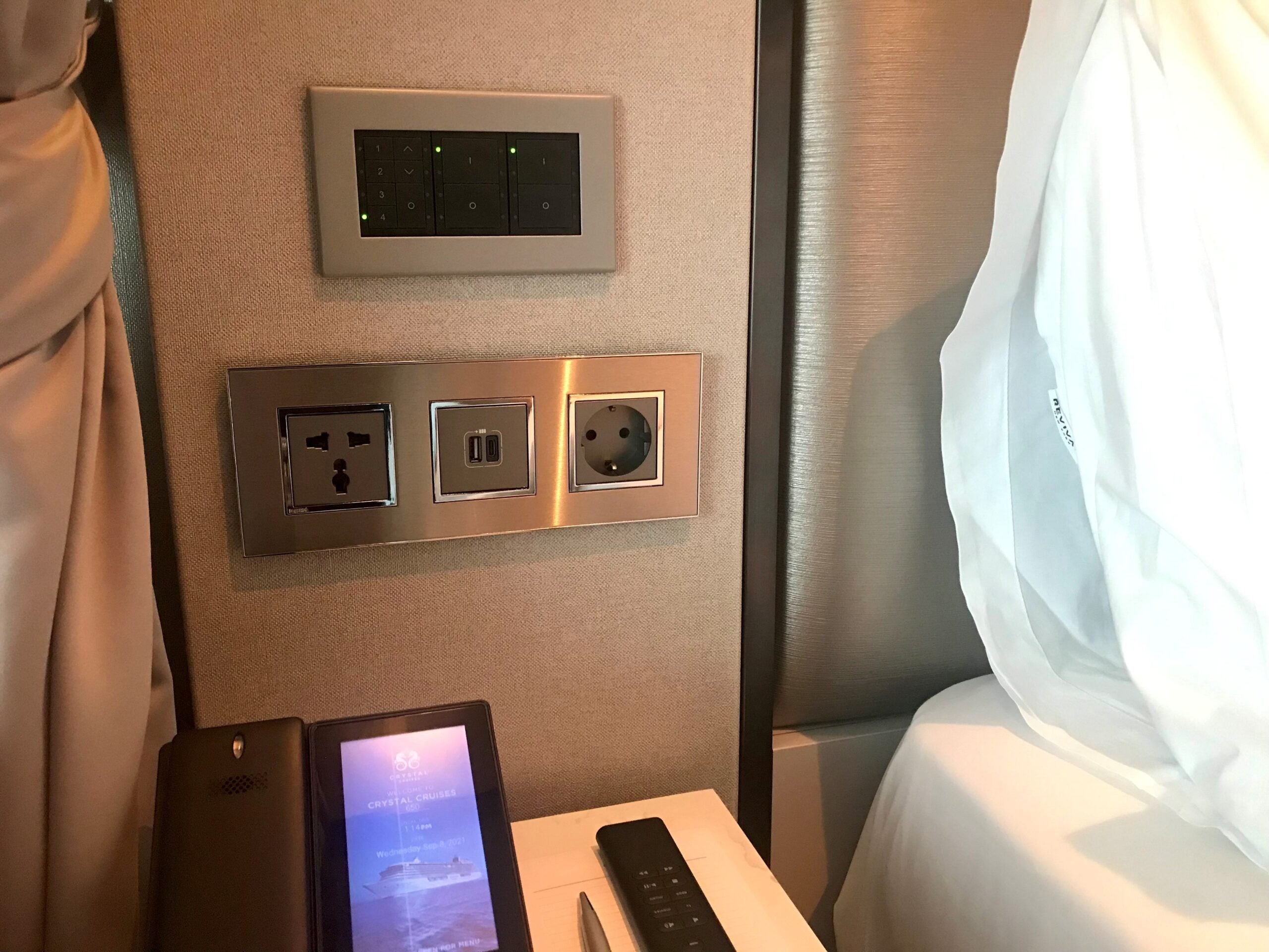Next to the bed, on both sides, are smart-looking side tables with drawers and (above the side tables) one of the most comprehensive bedside banks of charging outlets that I've ever seen on a ship (it'll take U.S., European and British-style plugs as well as two types of USB cords).