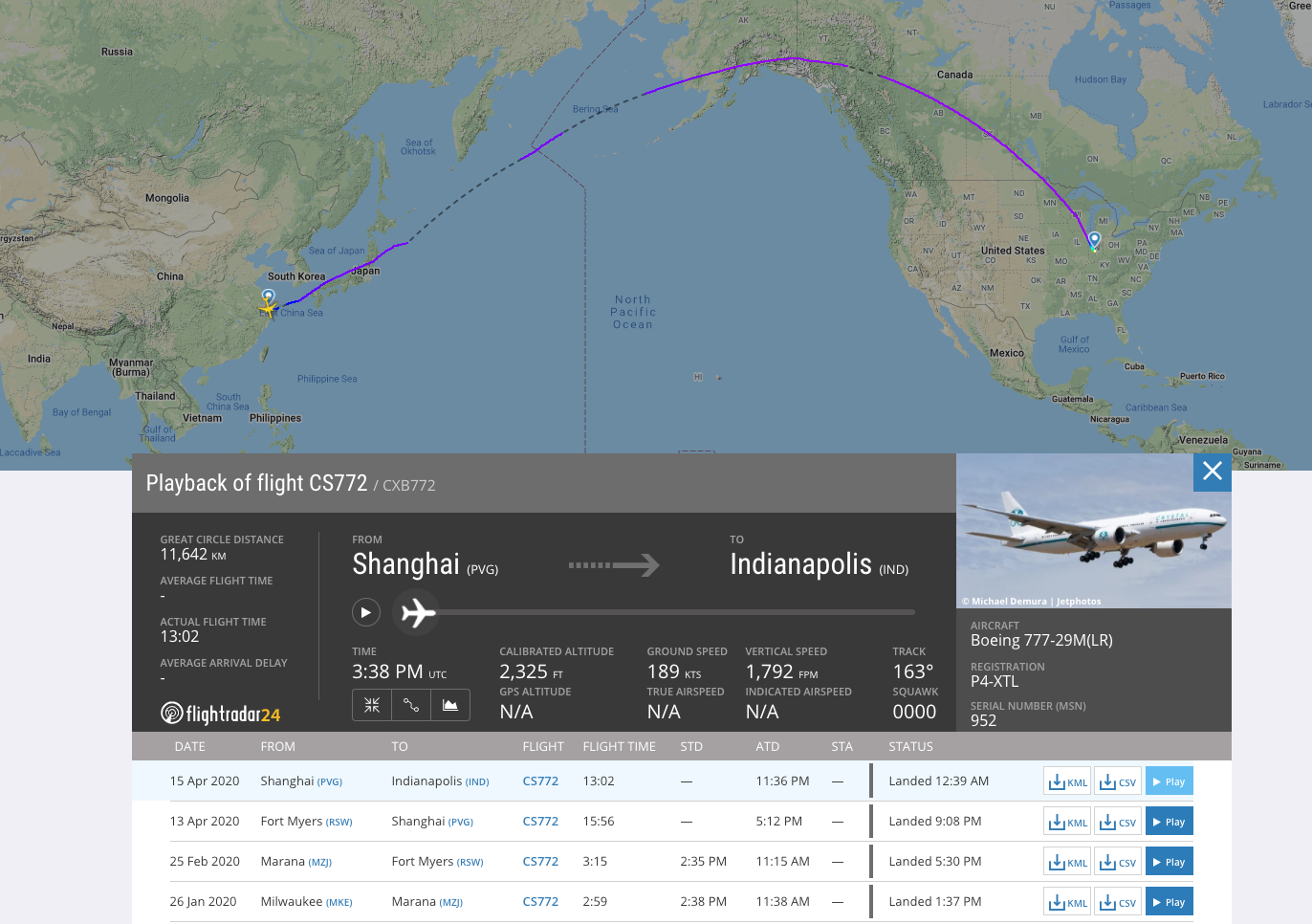 Flight-tracking site Flightradar24 showed that the plane flew from its home base in Florida to Shanghai on April 13 and flew back to Indianapolis on April 15, both nonstop flights. The cargo it carried back from China was transported in the cargo holds: "We were transporting PPE in the belly of our aircraft," Ziskind said. Airlines are doing the same to keep up revenue during the pandemic, switching some of their airplanes to carrying cargo in the holds where passenger luggage normally goes.