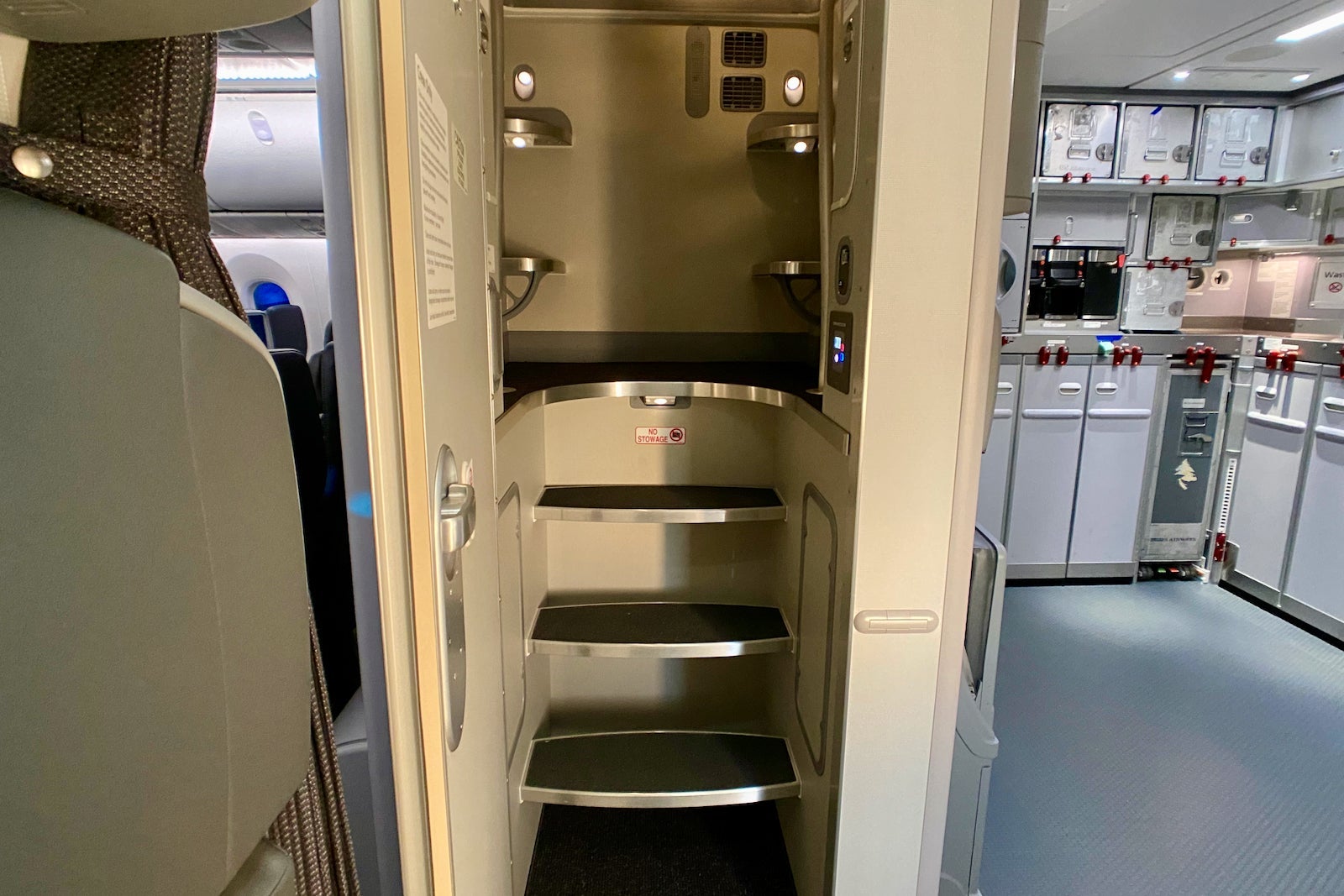 Inside, you'll find a handful of lie-flat bunks, with individual thermostats and other interesting items, including smoke detectors, fire extinguishers, flashlights and portable oxygen containers for use in an emergency. There are also comfort items, such as power outlets, a small mirror, coat hooks and a phone to call the other flight attendant stations.