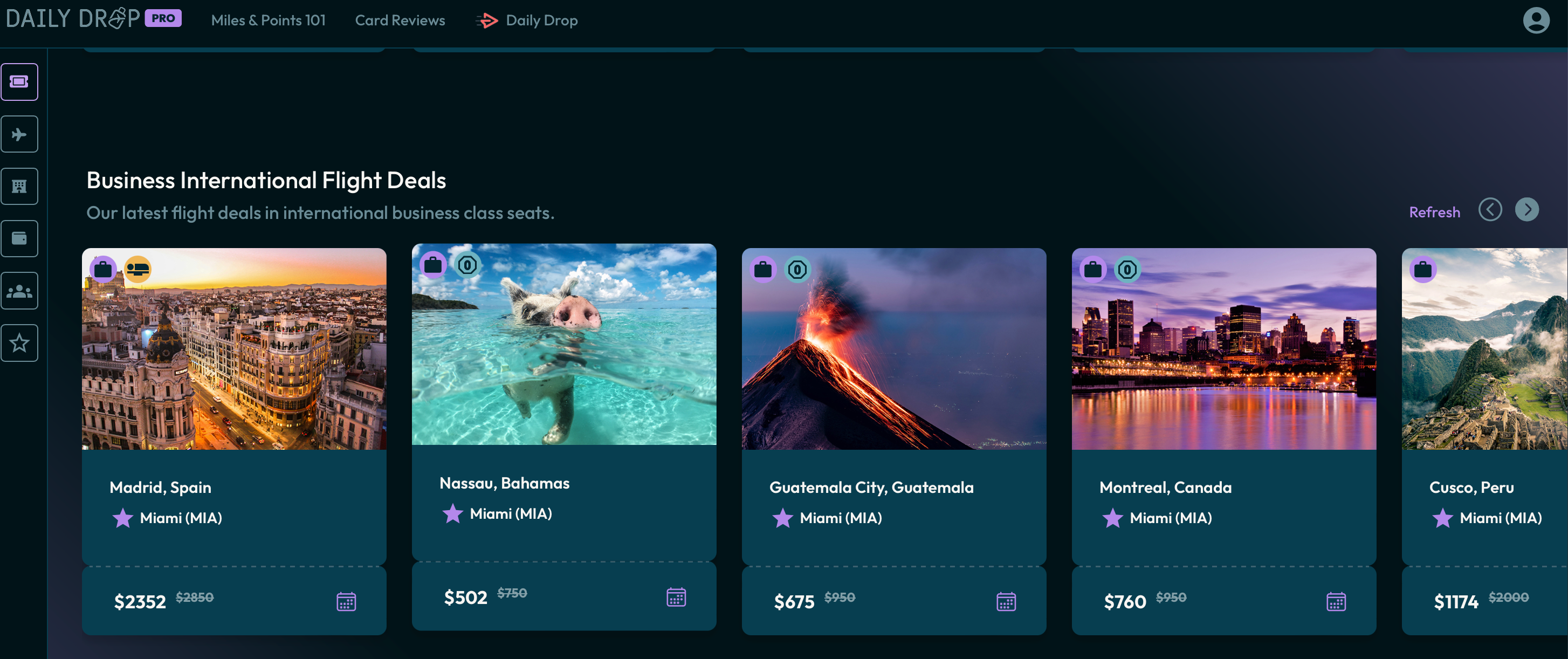Daily Drop says the two best ways to save money on travel are to let the deal determine the destination and to use points and miles to book trips. Its Pro subscription tier is designed to maximize both practices. For example, Daily Drop Pro subscribers get unlimited points and miles searches to find the best available redemptions. They also get cash deals emailed daily based on travel preferences. The site's wallet function lets you keep track of your points and miles. There is even a Pro Lounge — a private community with resources to help you as you seek out deals and what to do once you book your trip.