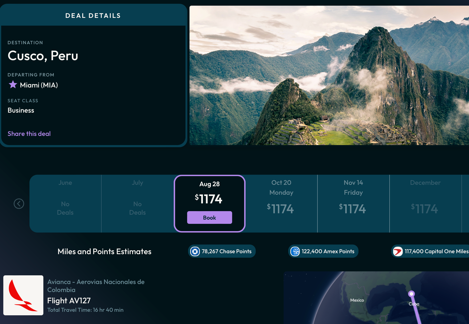 The vast majority of the daily deals sent out are for travel at least a month or two down the line, so don't expect to have to scramble for a last-minute flight to take advantage of a low fare. For example, here's a recent deal I received for a business-class flight on Avianca from Miami International Airport (MIA) to Alejandro Velasco Astete International Airport (CUZ) in Cusco, Peru. The deal is 40% off normal prices and for travel in August. The site also includes estimates for what it would cost to book using points.