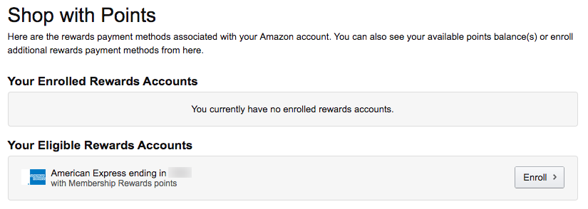 "For your convenience, American Express and Amazon have worked together to launch a new feature that automatically enrolls your American Express Membership Rewards® card to Shop with Points at Amazon.com. Now that you've used your card for your Amazon.com purchases, you can view your Membership Rewards® point balance and redeem for eligible purchases on Amazon.com, without the extra hassle of manually registering online."