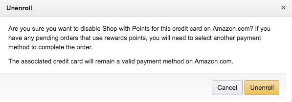 5. Click Unenroll to confirm that you want to remove the card from the Shop with Points option.
