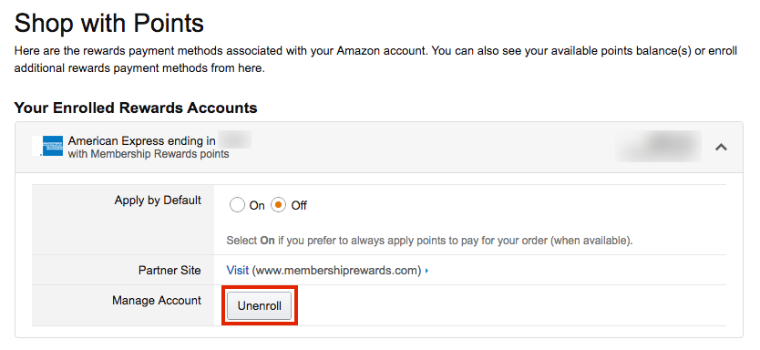 - Family member mistakes: My wife frequently uses my Amazon account when we're purchasing items for the baby. While I am quite confident that she would never redeem Membership Rewards points or Ultimate Rewards points for these purchases, there's still the risk that a family member using your Amazon account could select "Pay with Points" upon checkout. Removing the chance of this happening is critical.