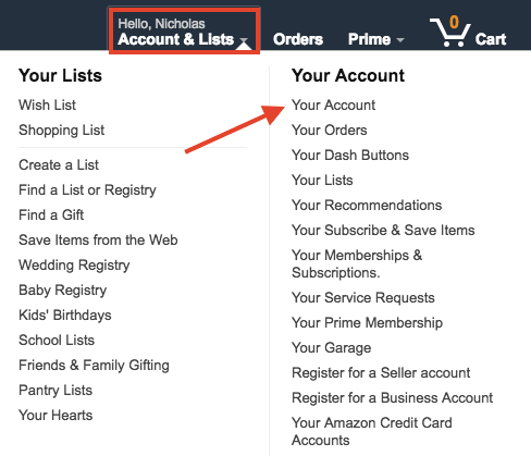 2. From the homepage, hover over the "Accounts & Lists" drop-down and select Your Account.