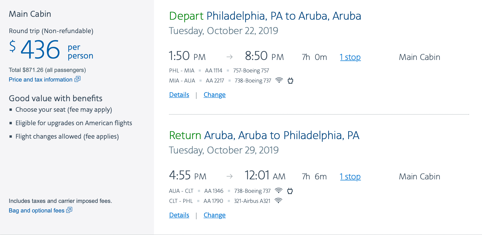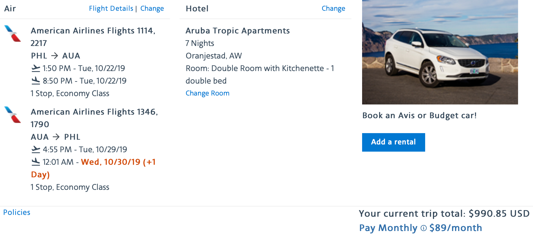 A weeklong vacation for two from Philadelphia to Aruba will cost just $991 after applying the promo code, as shown here: