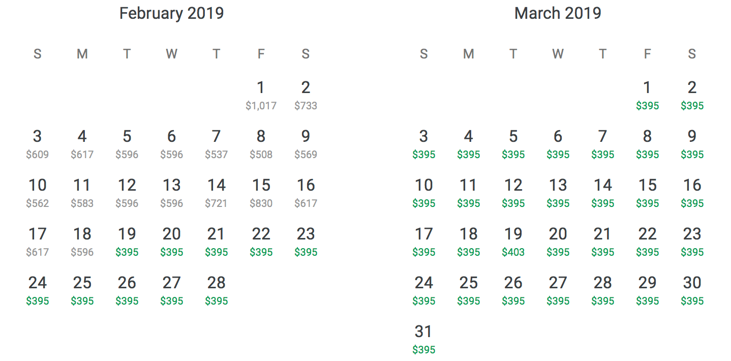 To search for these flights, head to Google Flights and enter your origin and destination cities. Scroll through the calendar function to find dates and prices that work for you. Finally, click through to book directly with the airline or through an OTA like Cheap-O-Air, Priceline, or Expedia. Note: the total cost will differ from what's on the Google Flight results page and what's offered through sites like Cheap-O-Air, Expedia, and Priceline. Check each OTA's final price to ensure you are booking a deal fare. Also, note that Cheap-O-Air is the most consistent OTA in regards to actually offering the fares seen through search engines like Google Flights and Kayak.