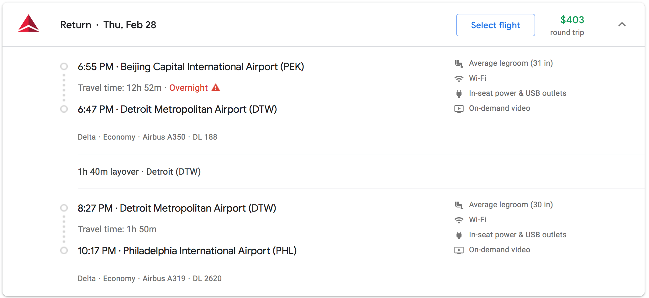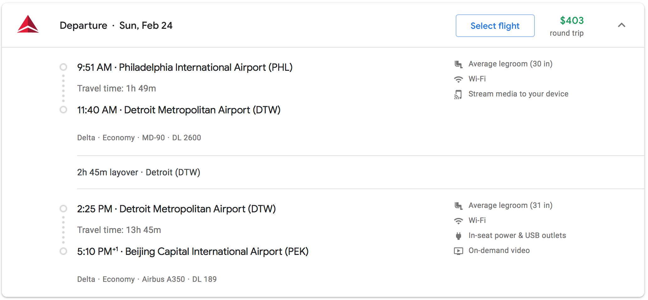 Philadelphia (PHL) to Beijing (PEK) for $403 round-trip on Delta: