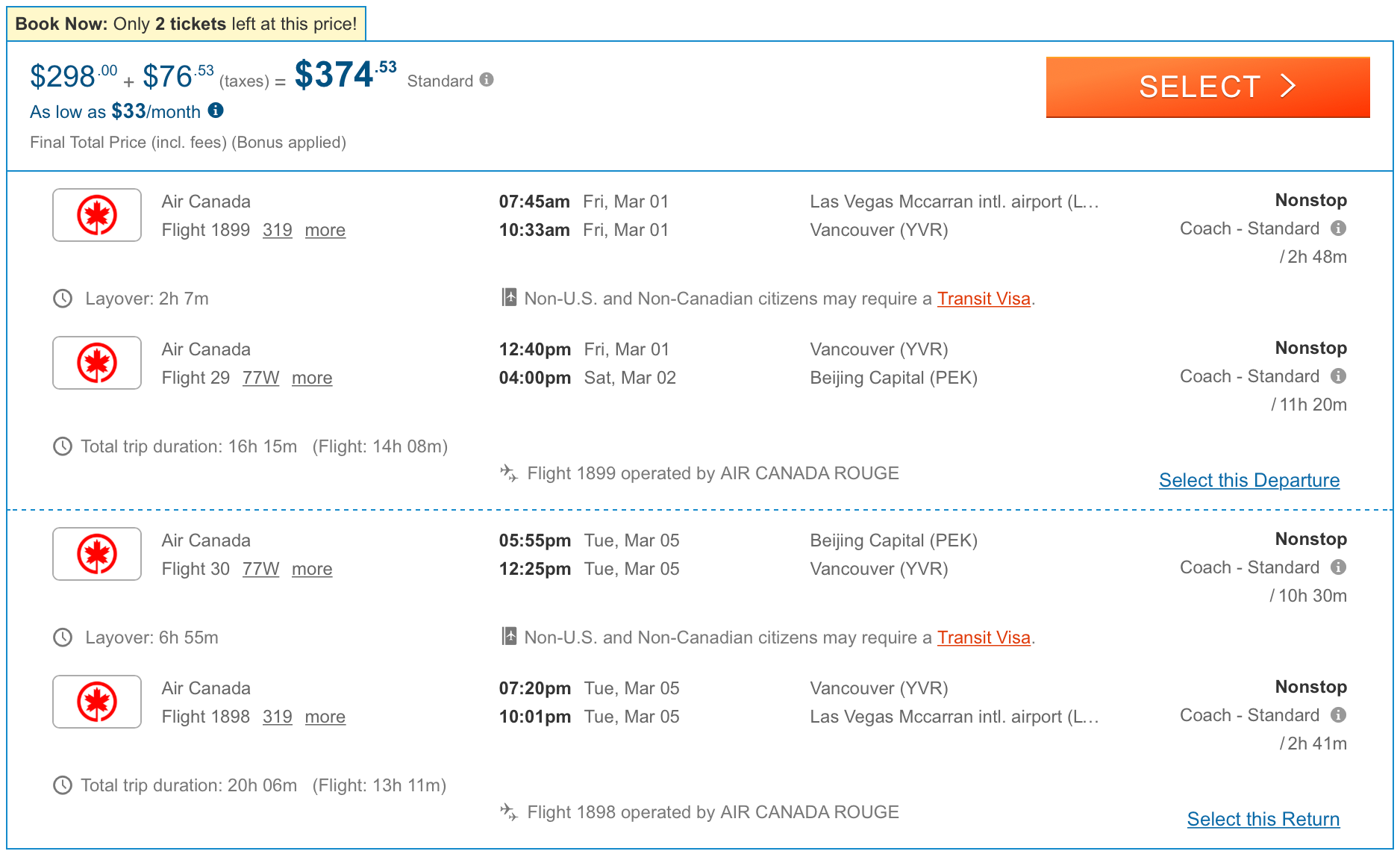 Las Vegas (LAS) to Beijing (PEK) for $375 round-trip on Air Canada via Cheap-O-Air: