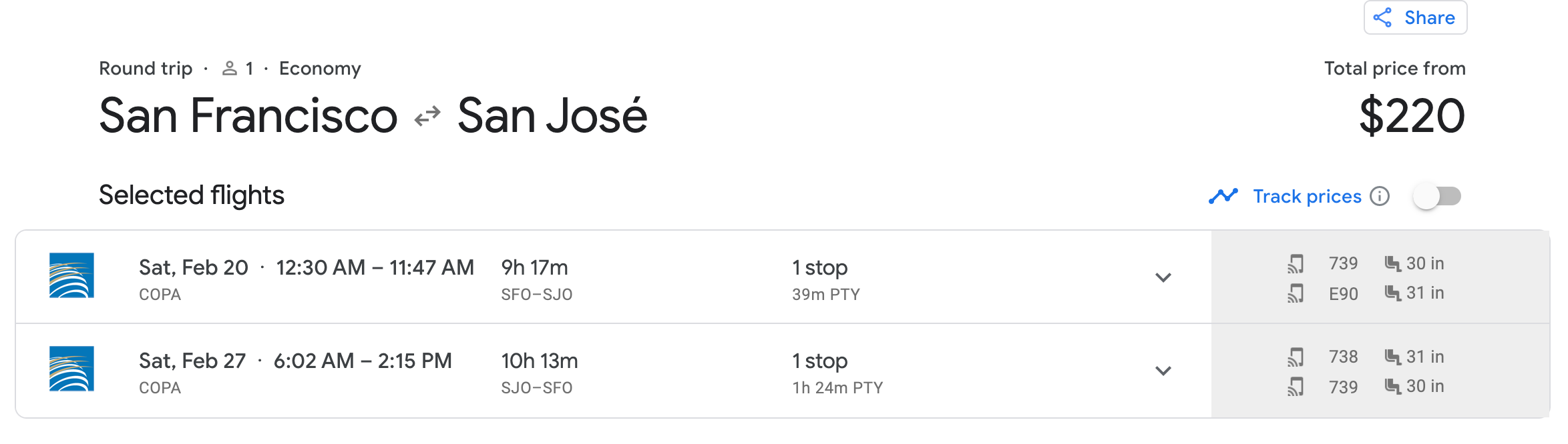 San Francisco (SFO) to San José, Costa Rica (SJO) for $220 round trip on COPA: