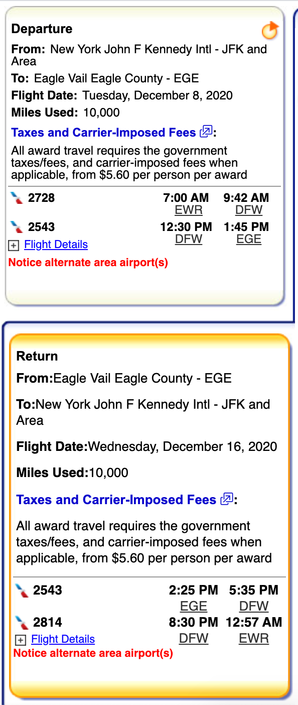 Newark/New York (EWR) to Vail (EGE) for 20,000 AAdvantage miles and $11.20 round trip on American: