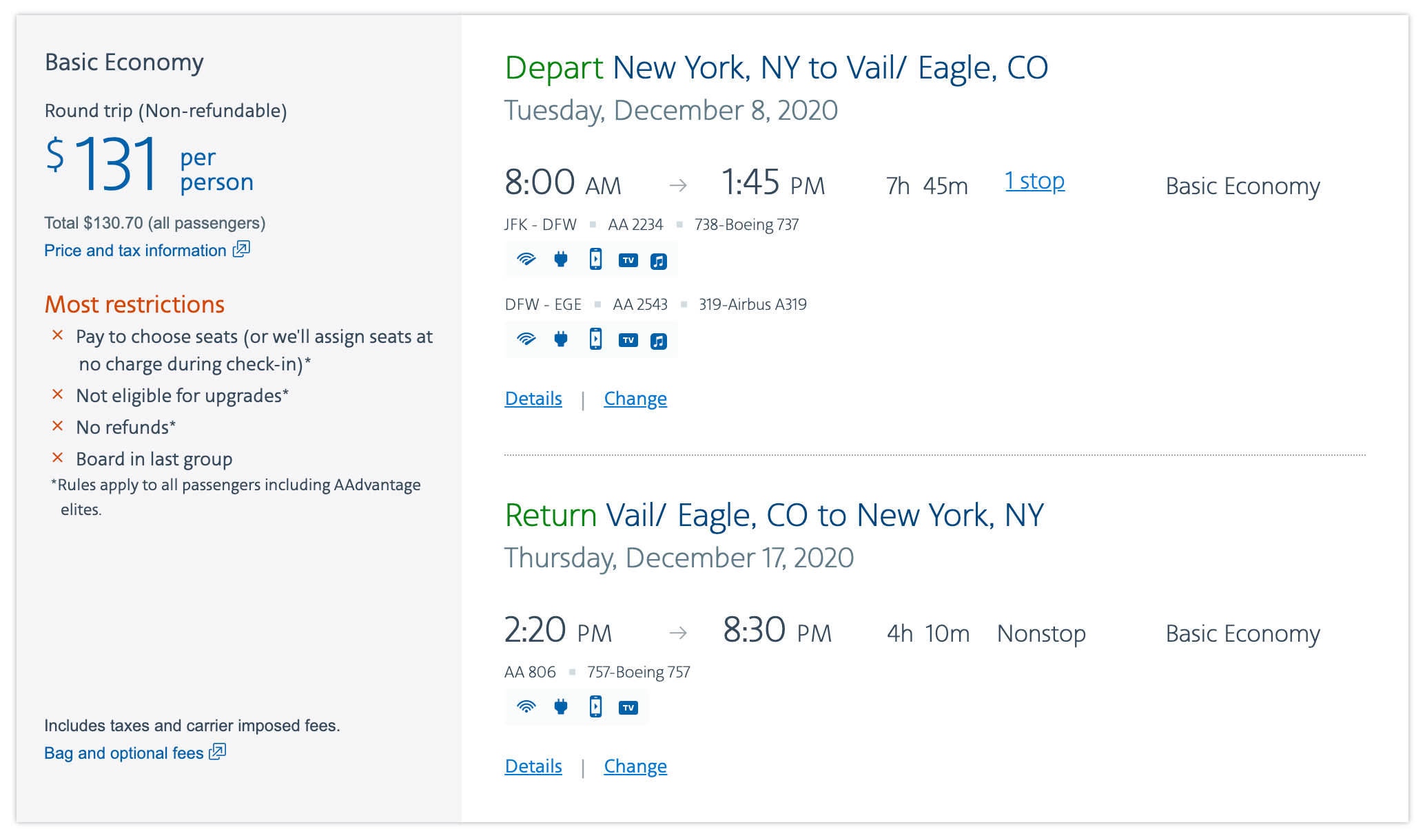 If you are interested in getting something on the books, or even just want to daydream about travel, here is a sampling of one-way paid and award flight deals we are seeing to Vail for the second half of 2020 and into early 2021. Even better yet, American Airlines currently offers fee-free changes on all tickets booked before May 31. And if you're sitting on a stash of American miles, you can get a round-trip ticket for 20,000 AAdvantage miles plus $11.20.