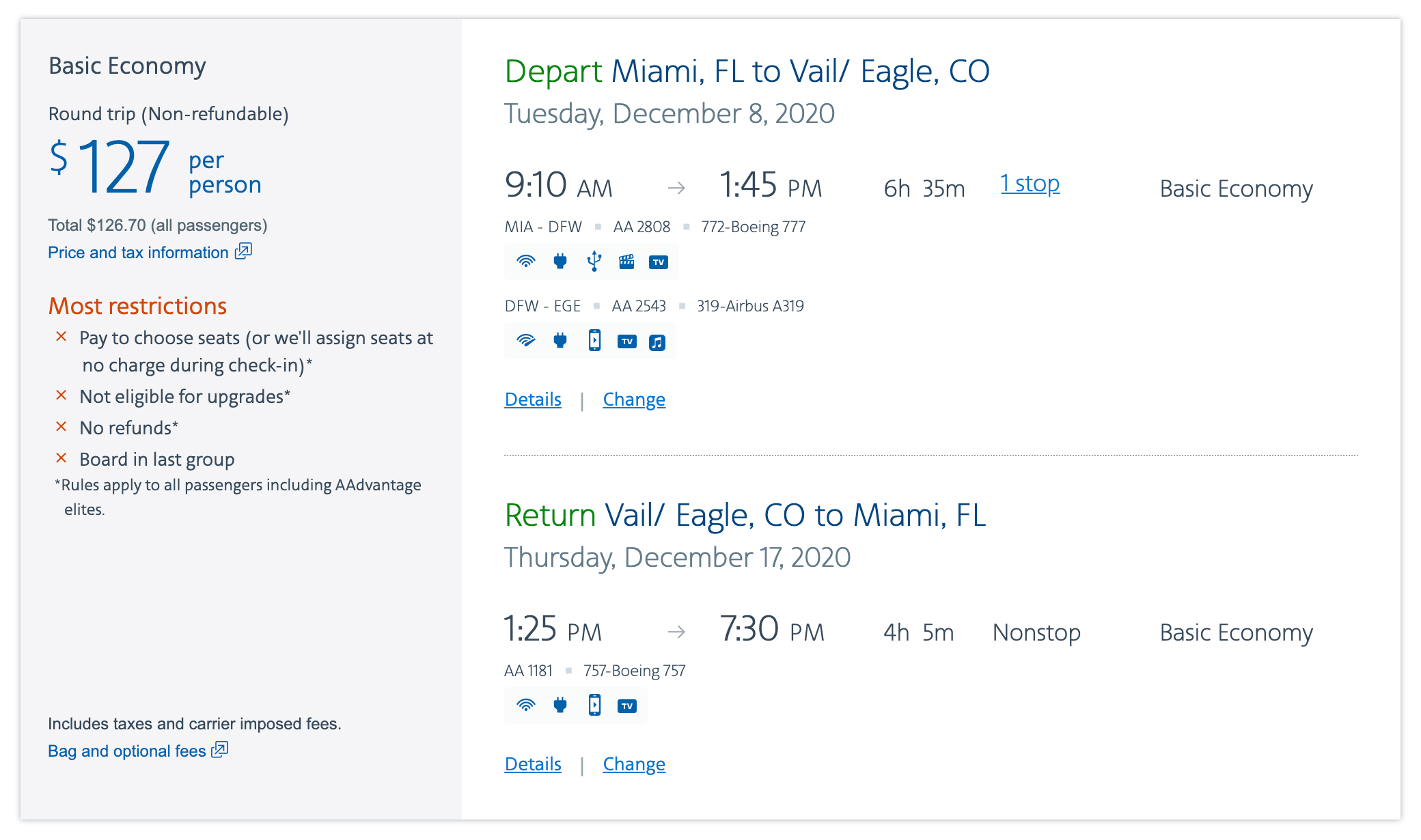 Miami (MIA) to Vail (EGE) for $127 round trip on American: