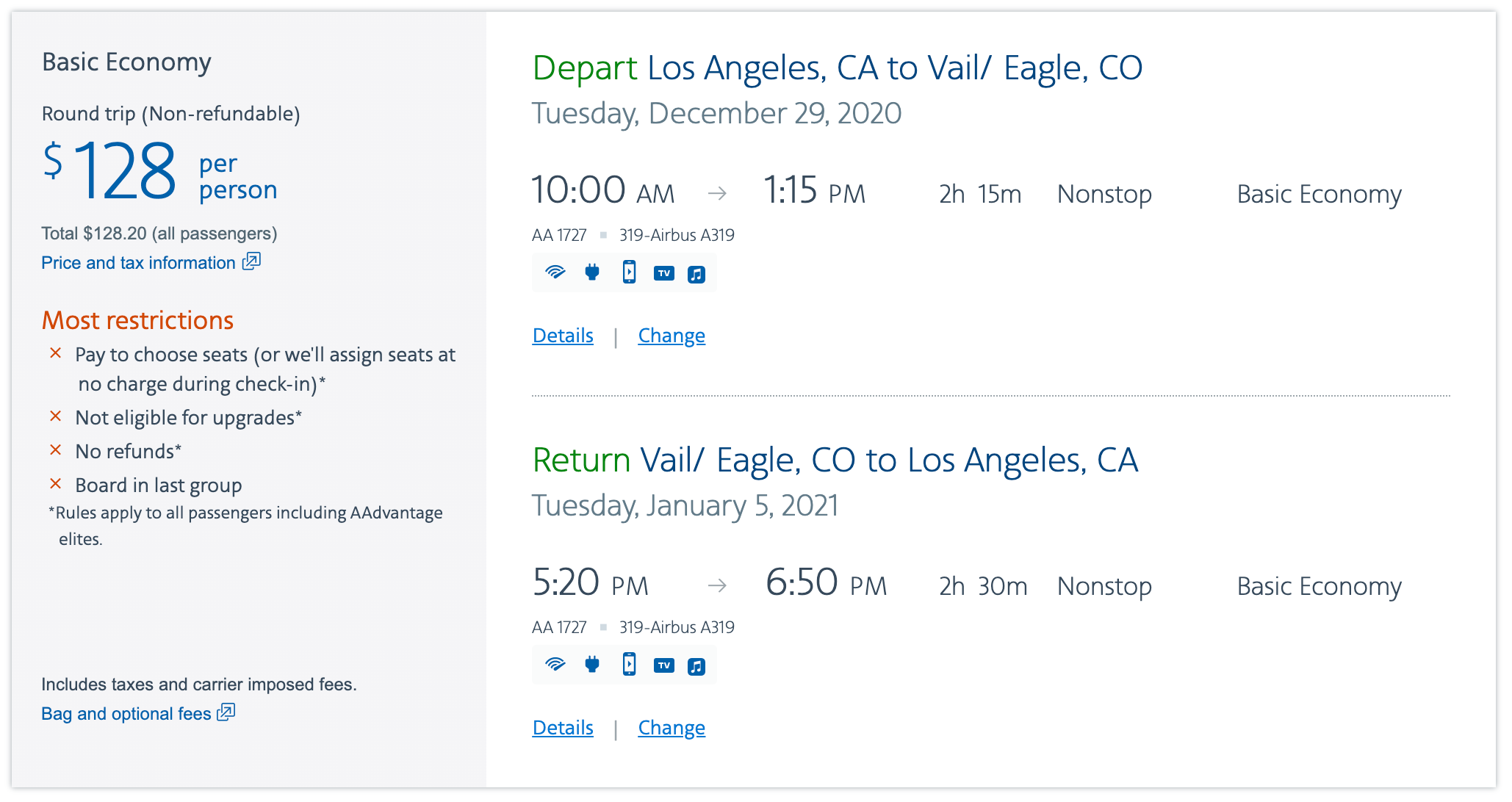 Los Angeles (LAX) to Vail (EGE) for $128 round trip on American: