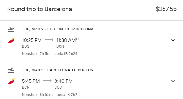 Boston (BOS) to Barcelona (BCN) for $288 round-trip: