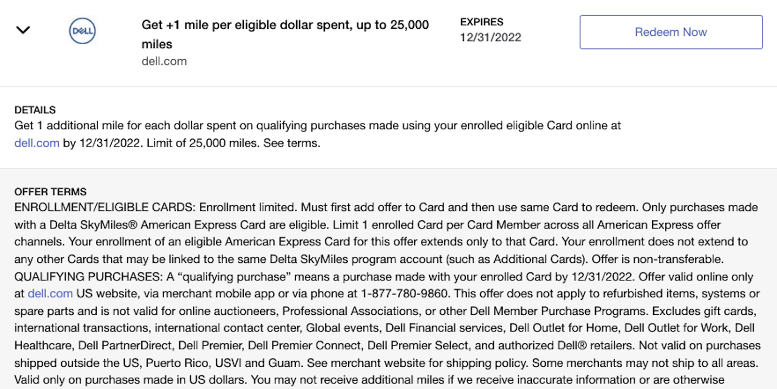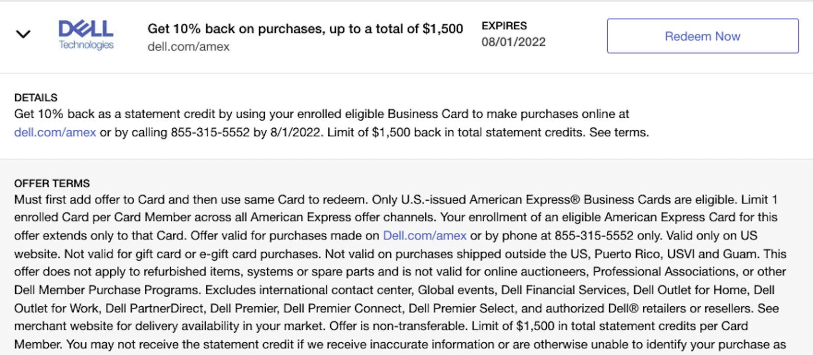 The details of these Amex Offers note that the offer is only good for eligible purchases online at dell.com/amex, but the terms also note that phone purchases are eligible — indicating that any Dell purchase likely will trigger the offers.