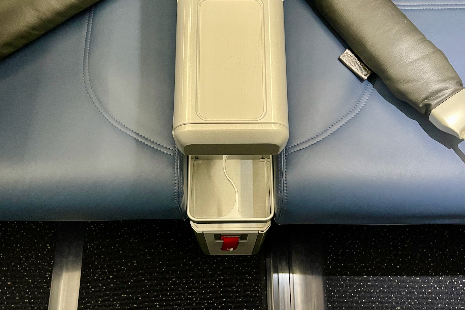 Seats have plenty of storage. In addition to the seatback pocket, the inner armrest has some space for an iPad or book. There's also a bottle holder in between both seats — a nifty addition for those prone to spilling drinks.