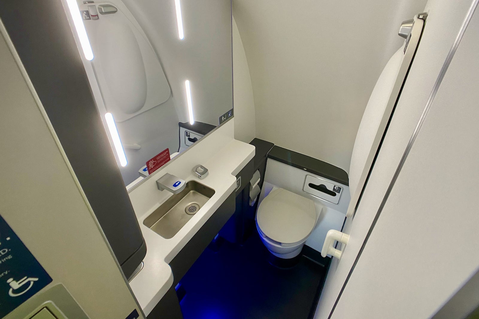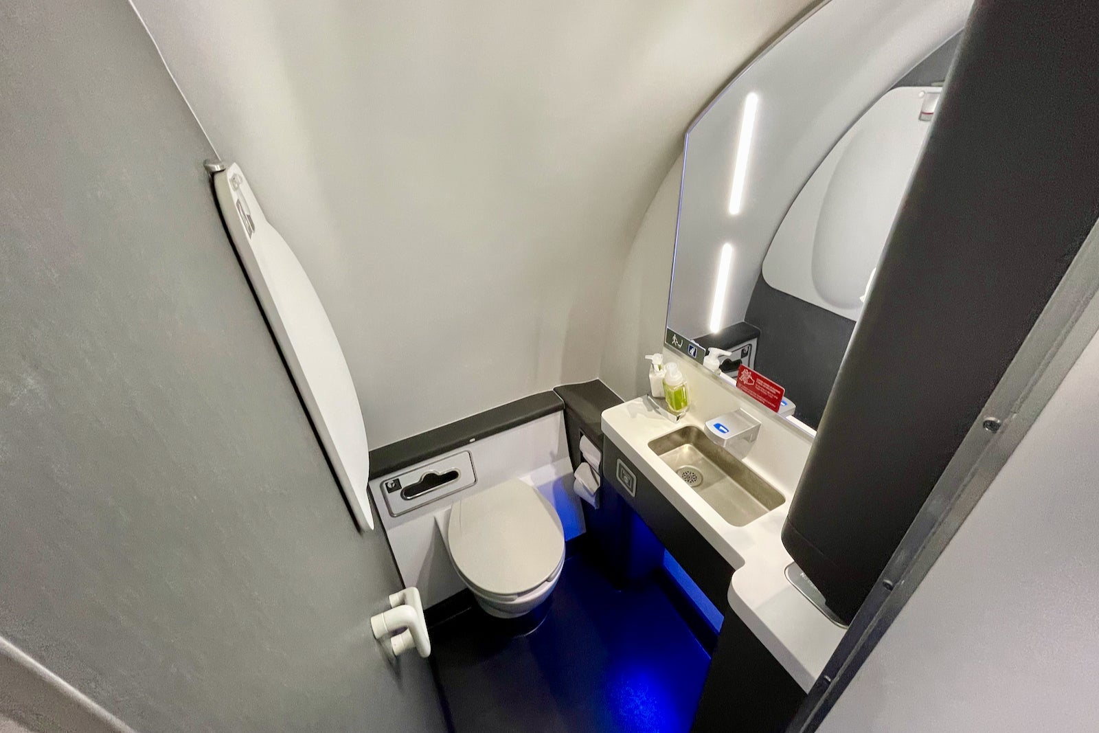 There are two other lavatories onboard (sans windows) — a smaller one on the starboard side at the rear and a larger one at the front that's usually reserved for first class.