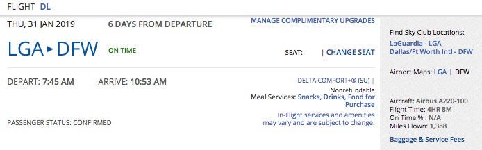 I currently have two flights confirmed for Jan. 31, 2019, which were previously scheduled to operate on the A220. As of now, both flights still show "Aircraft: Airbus A220-100" in my Delta account, but Delta has informed me that I'll learn what my new aircraft type will be this weekend.