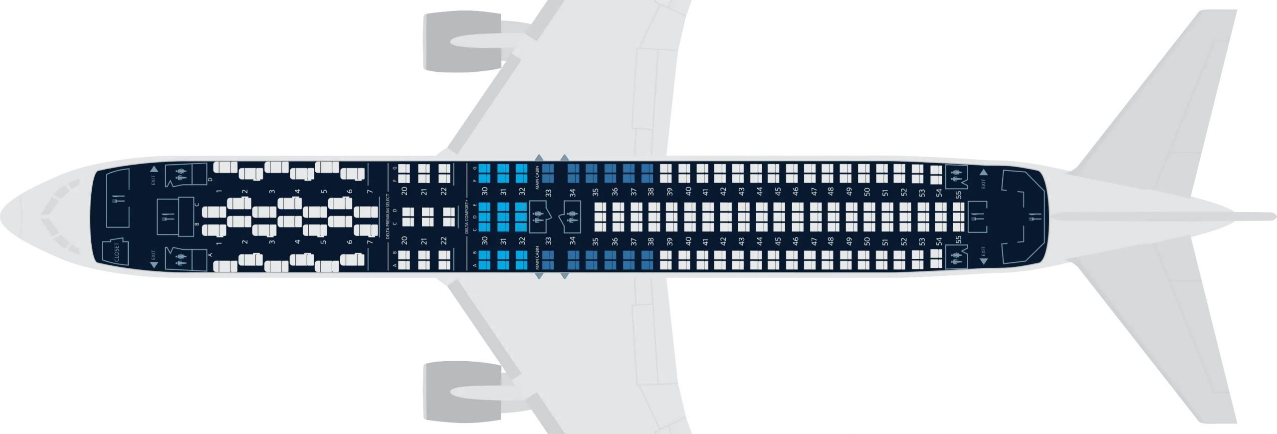 While there's no seat-map available just yet for the A330, Delta has already shared the new layout for the retrofitted "76K." As you'll see, the Premium Select cabin on the Boeing 767-300ER is coming at the expense of coach seats.