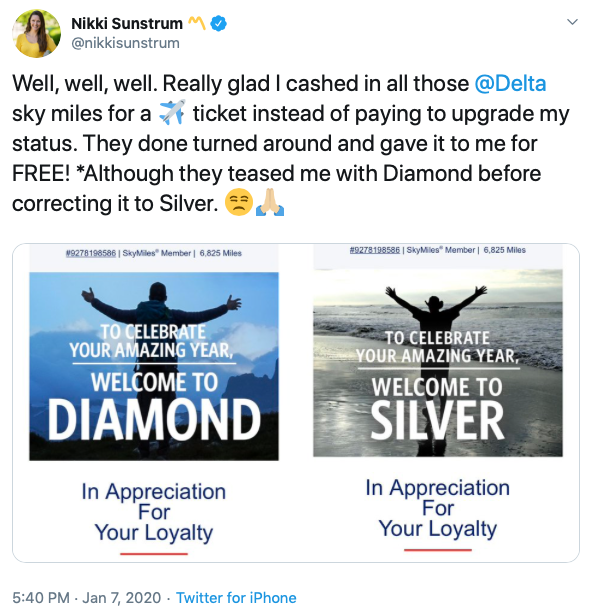 Other users are reporting similar issues. Nikki Sunstrum tweeted that she'd been "teased" with Delta Diamond status before it was corrected to Silver.